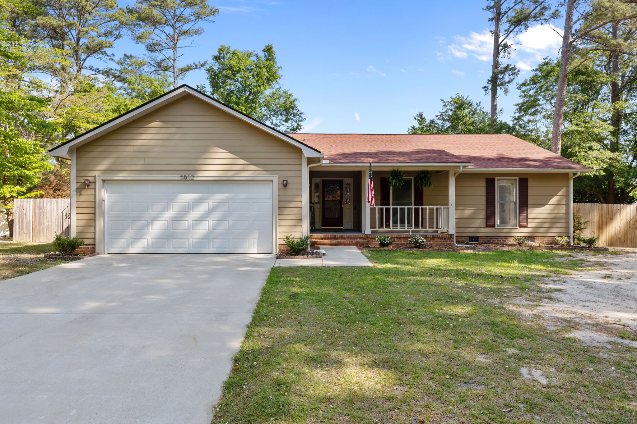 Welcome to 5812 Tuckertown Ln in Fayetteville, a move in ready ranch style home located in the established neighborhood of The Lakes and just 10 minutes from the main gate of Fort Bragg. Conveniently situated near shopping, dining, and entertainment, this 3 bedroom, 2 bathroom home offers both comfort and character. From the inviting covered front porch, perfect for rocking chairs, to the spacious fenced backyard made for entertaining, this home has been meticulously maintained and thoughtfully updated. Inside, you’ll find a vaulted living room ceiling with a wood beam, abundant natural light, ceiling fans, cordless blinds, and a wood burning fireplace accented by a beautiful brick surround and wood mantel. A large flex space with a wet bar adds even more versatility for entertaining, hobbies, or relaxing. Outside, enjoy the back patio, large fenced yard, new fencing with double gates on both sides, and a stone RV or recreational vehicle parking area that offers the perfect place to store your toys. The 2 car garage offers exceptional functionality with extensive built in storage shelving. Additional updates include a new HVAC in 2025 and installed leaf guards.